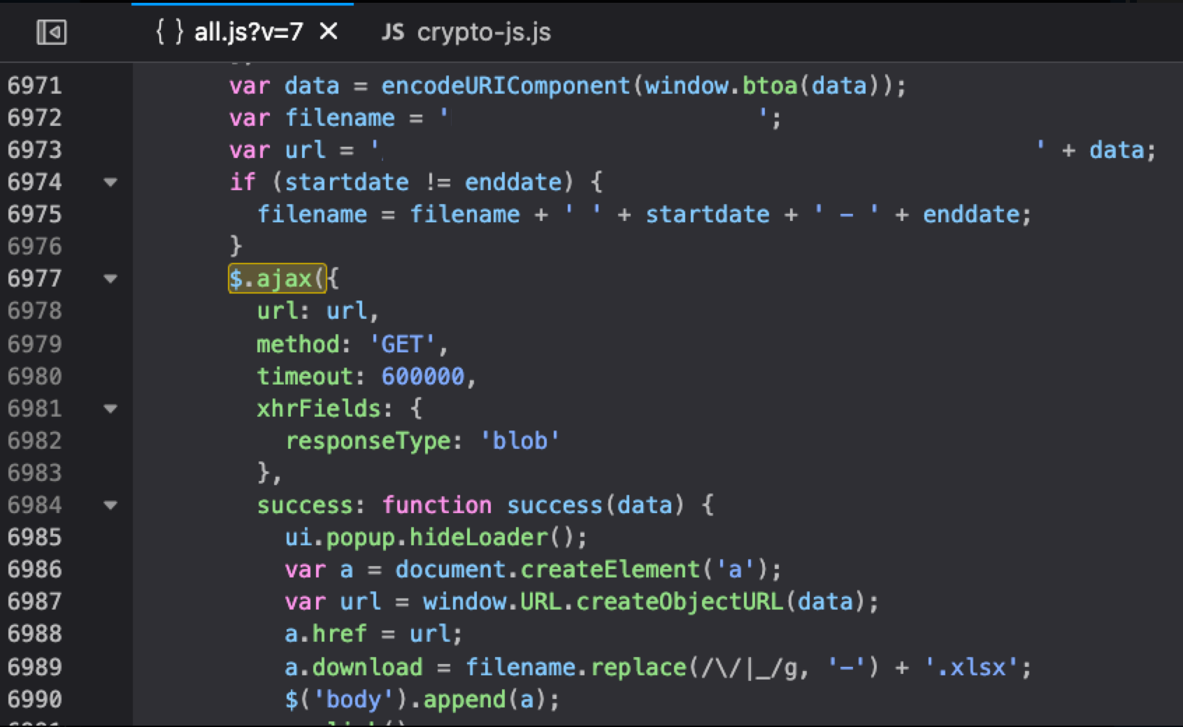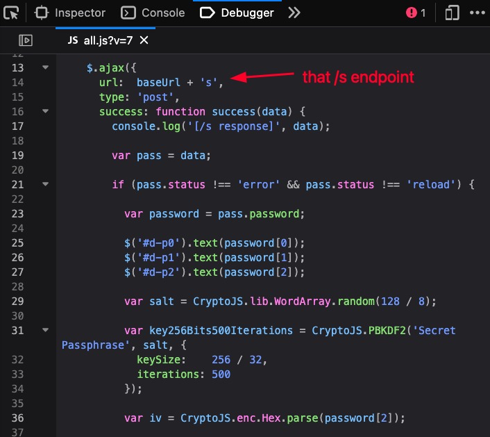 One fact that we already know is the system called the /s endpoint to retrieve the (presumably) key, so there must be any fetch/ajax/axios or any API call attempt that calls that endpoint. After scrolling through the code a bit, we discovered that the API is being called using ajax.