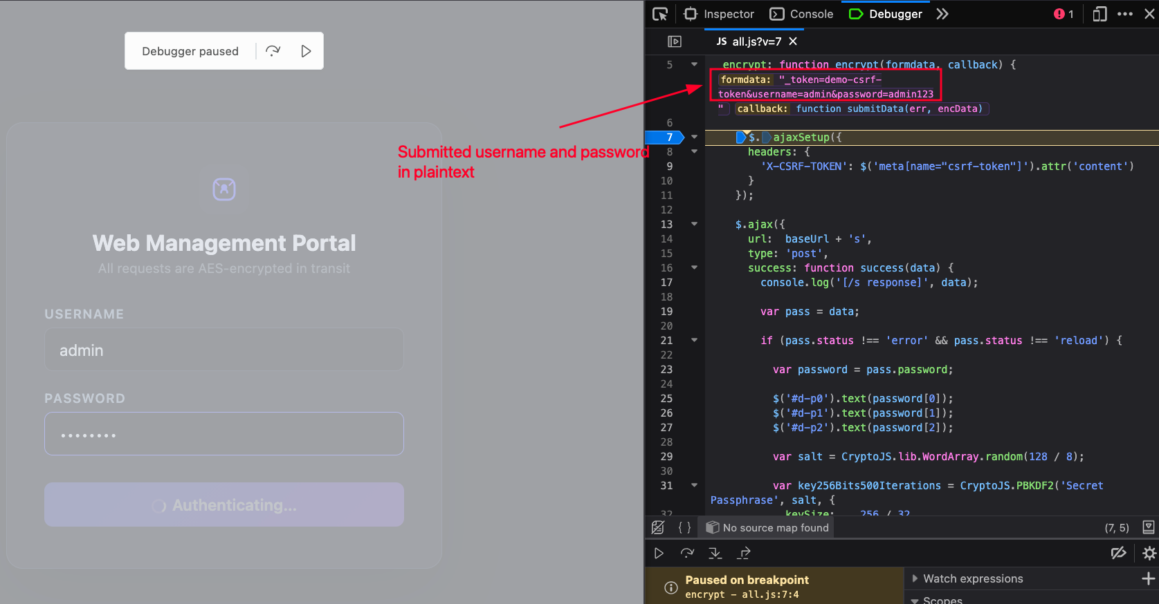 The breakpoint is set on line 7, the first line to execute right after the function called. The debugger shows the value of each arguments: first argument is formdata which is the plaintext of username and password, the second one is a callback that calls a submitData function passing the encData later.