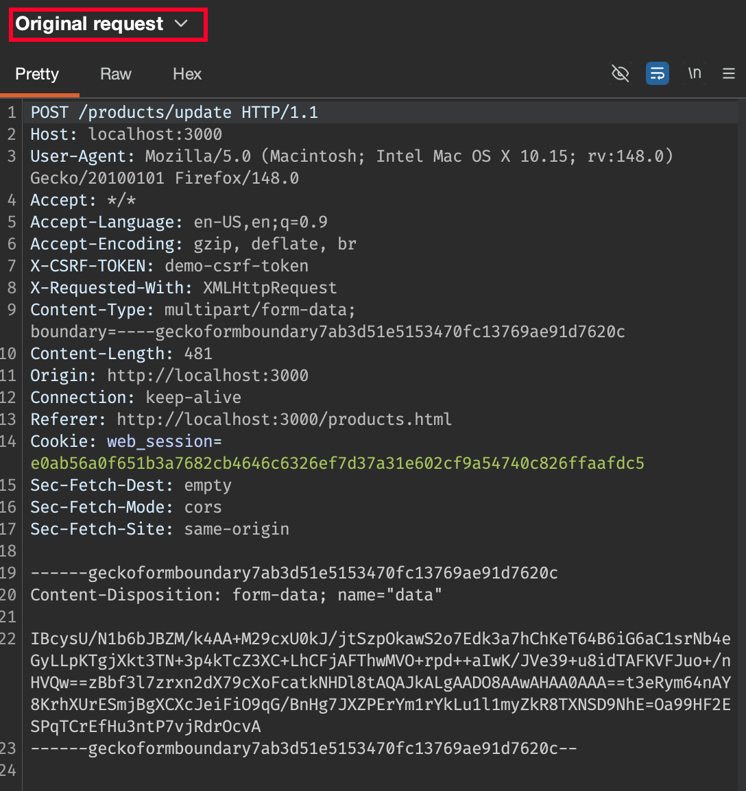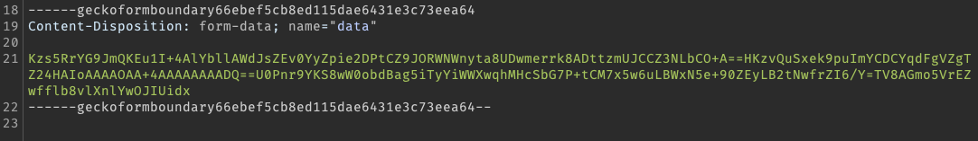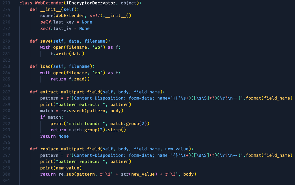 This is the class initialization of my extender. I made the save and load to simplify the write and read process of the key into txt file (will be discussed later). The extract_multipart_field and replace_multipart_field are used to get the pattern of the encrypted values within the data parameter inside the multitype/form-data format like this.