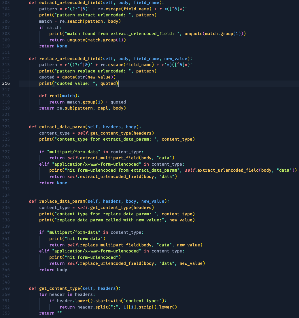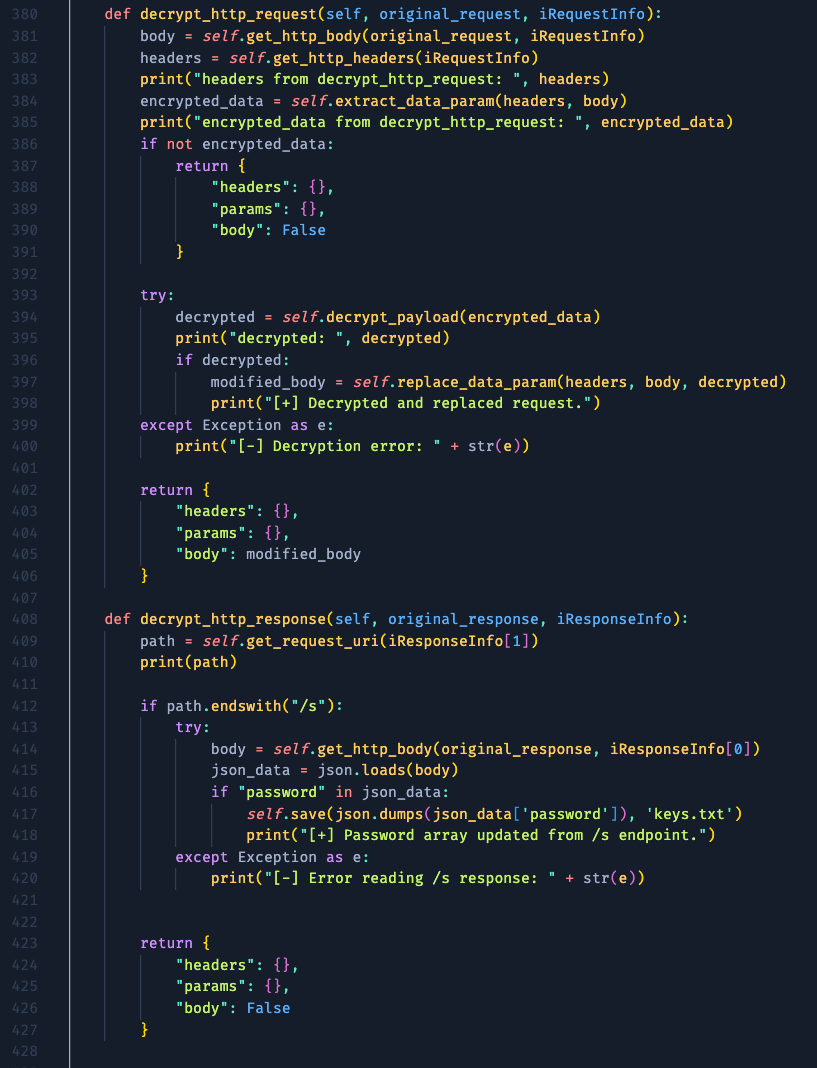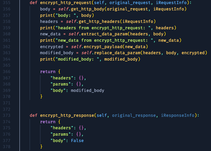 The get_http_body function is also a built-in function that made to get the whole request body. It is then passed to the previously made extract_data_param that handles the content type whether it is multipart field or urlencoded field, re-encrypt the modified value later on, and replace the value using replace_data_param function. The function then returns an object (or dictionary in Python) that purposefully made to modify headers, params, and body, respectively. The modified_body is passed to the returned body value to alter the request body. Since we don't need to modify anything on the response, we left the function as is.