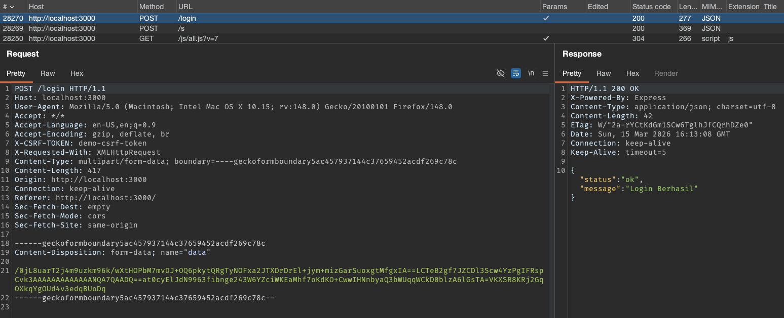 As we see, the request sent using Content-Type: multitype/form-data with the value of "data" param is encrypted. The response shows "Login Berhasil" which means it is a valid credential and successfully logged in