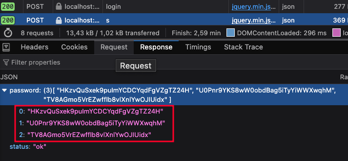 It returned an array called password contains three indices of strings. My initial assumption is that it would be a key for the encryption, dynamically generated from the server-side to be used on each POST request.