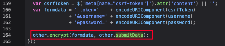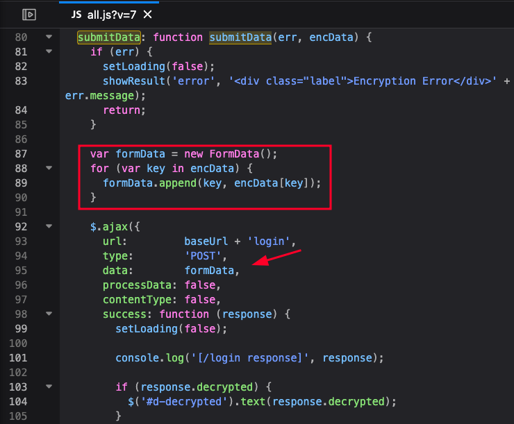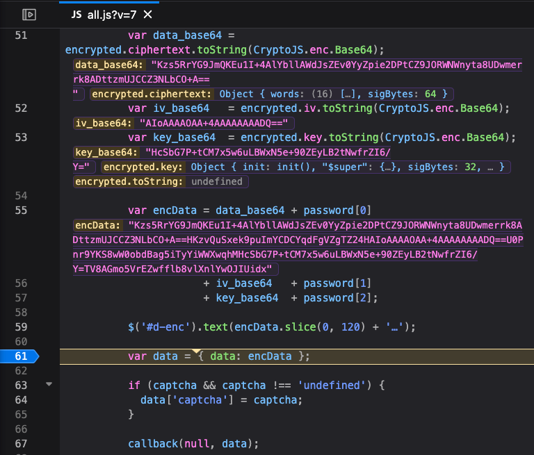 Finally, the final encrypted value is stored on the encData variable by concating the base64 of data, first index of password, base64 of iv, second index of password, base64 of key, and last index of password. The code has now reached the line 61 where the final data object created. Last, line 67 calls the callback function (submitData) to pass the data , which is an encrypted data, to the POST request of the corresponding endpoint.