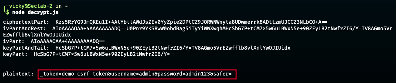 ciphertextPart,ivPart, andkeyPart) then passed into CryptoJS arguments to be decrypted into a plaintext.