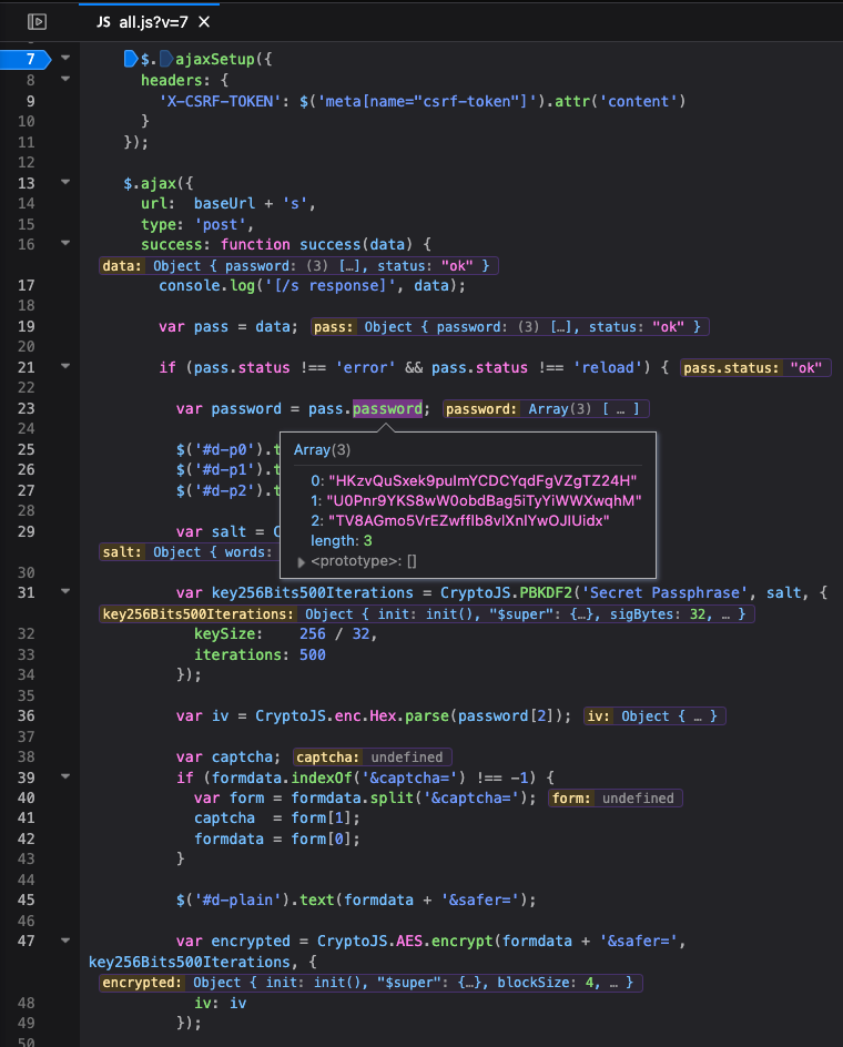 The encryption algorithm is seemingly an AES-CBC. We can verify the password array obtained from the endpoint is similar by checking the API response from the Network tab below.